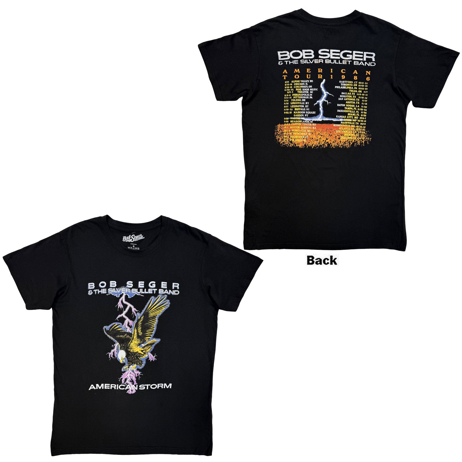 Bob Seger & The Silver Bullet Band Carbon T-Shirt: American Storm (Black) (Back Print) - A Rockoff official licensed product featuring the American Storm design motif.