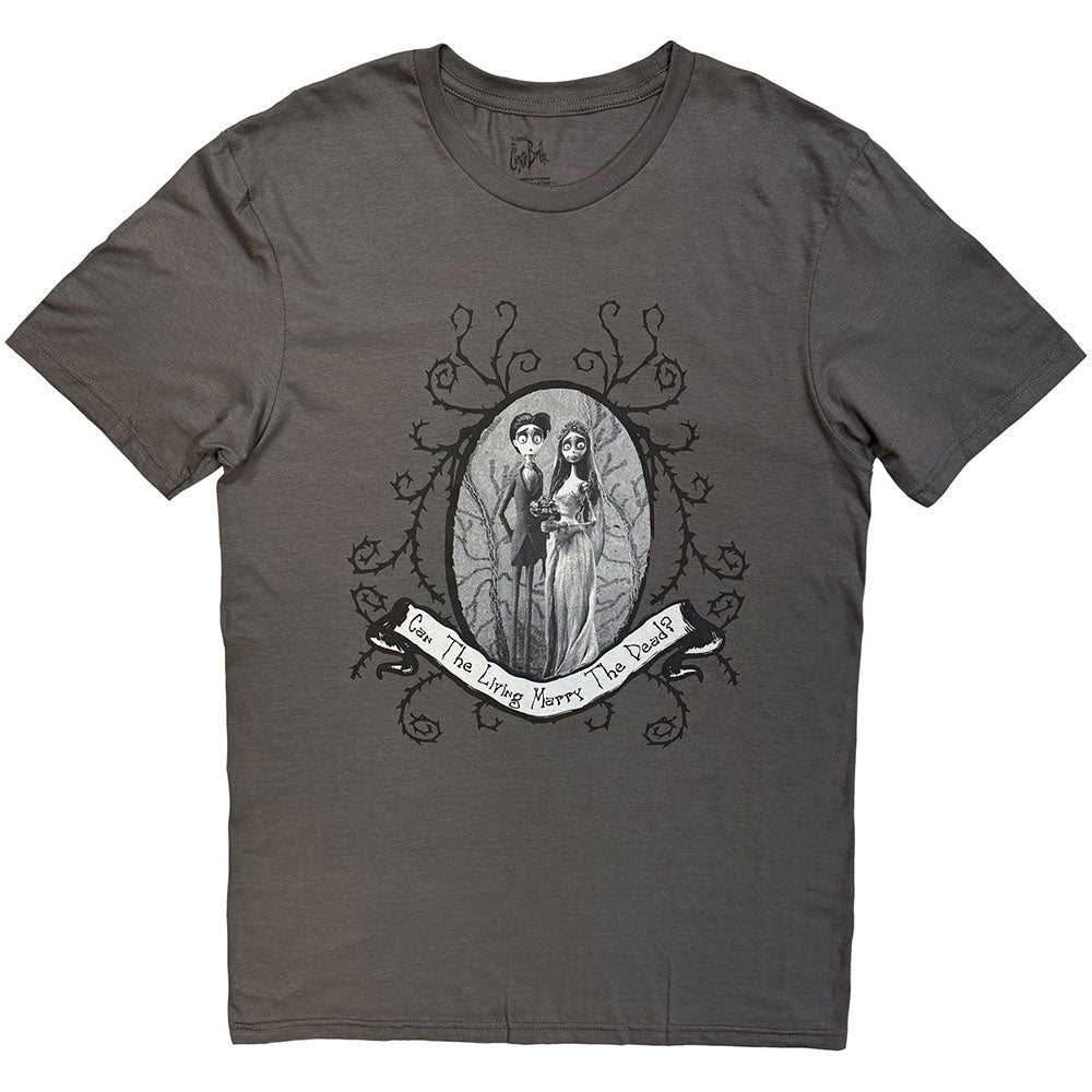 Corpse Bride T-Shirt: Can The Living Marry The Dead? (Charcoal Grey) - A Rockoff official licensed product featuring the Can The Living Marry The Dead? design motif.