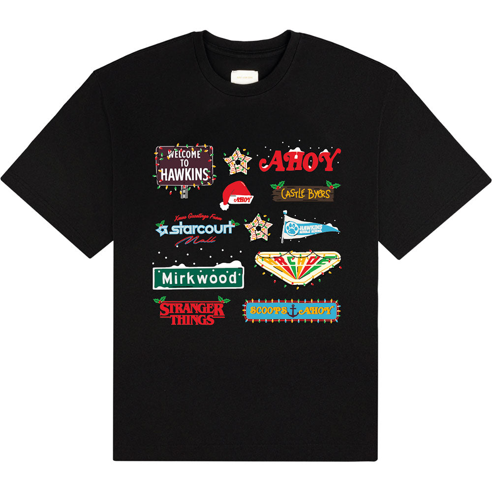 Stranger Things T-Shirt: Deck Christmas Sign (Black) - A Rockoff official licensed product featuring the Stranger Things - Deck Christmas Sign design motif.