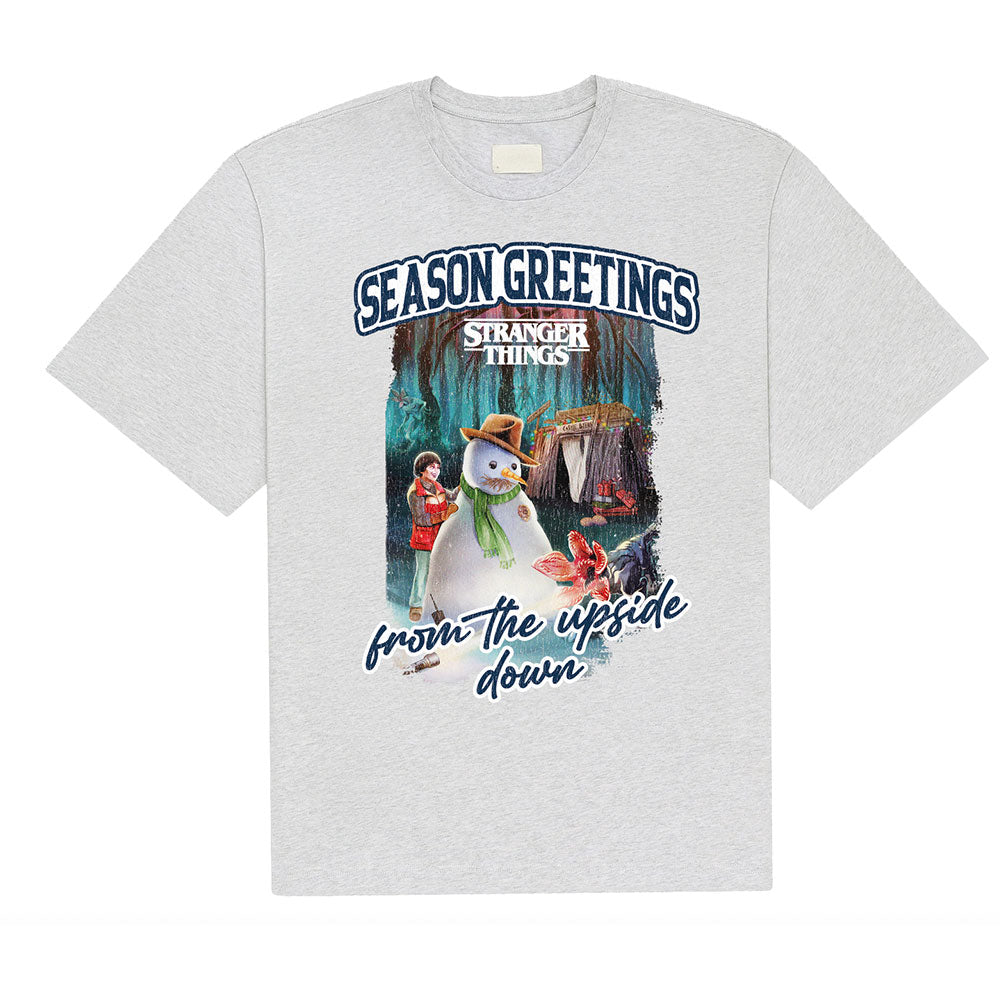 Stranger Things T-Shirt: Greetings (Grey) - A Rockoff official licensed product featuring the Stranger Things - Greetings design motif.