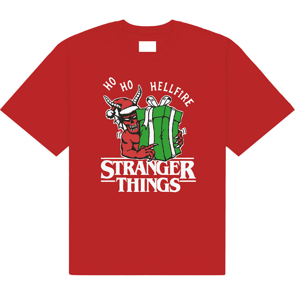 Stranger Things T-Shirt: Ho Ho Hellfire (Red) - A Rockoff official licensed product featuring the Stranger Things - Ho Ho Hellfire design motif.