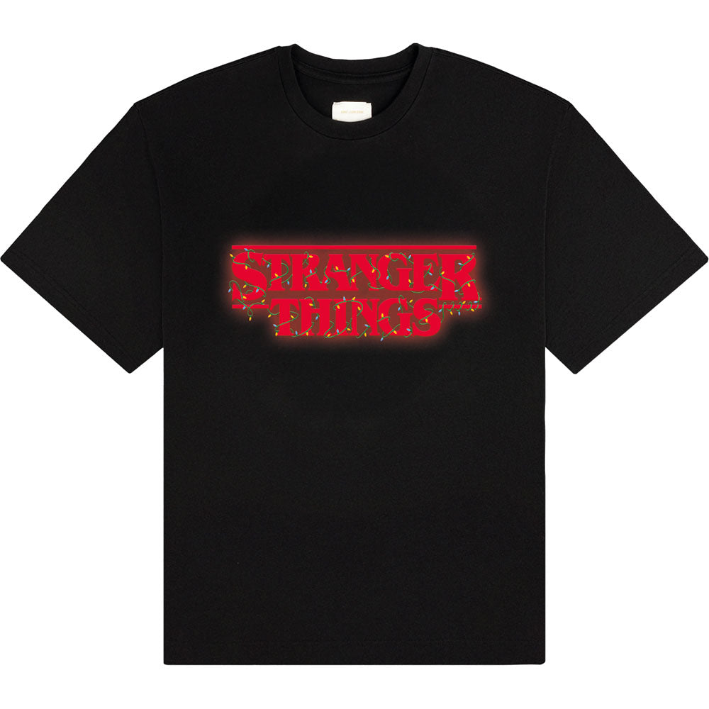 Stranger Things T-Shirt: Logo With Christmas Lights (Black) - A Rockoff official licensed product featuring the Stranger Things - Logo With Christmas Lights design motif.
